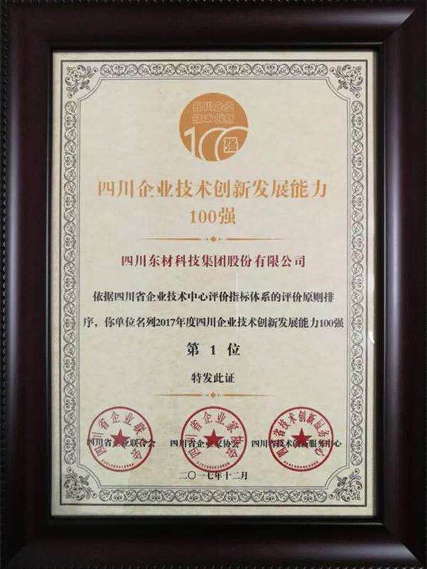 12月8日,2017四川100強企業(yè)發(fā)布會在成都舉行。四川東材科技集團股份有限公司在企業(yè)技術創(chuàng)新發(fā)展能力100 強中位列第一。